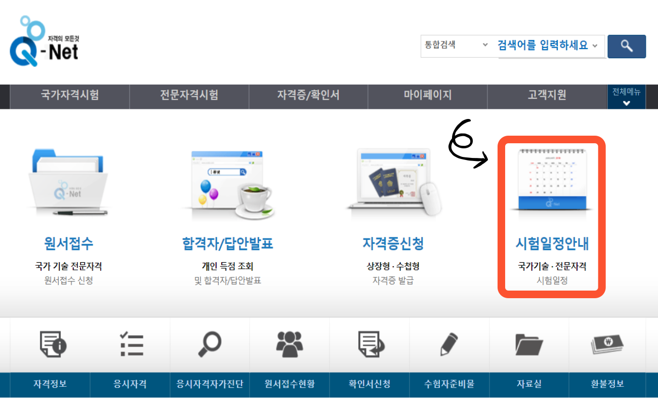 ① 아래 링크를 통해 큐넷 홈페이지에 접속한 후 우측에 있는 '시험일정 안내'를 클릭합니다.