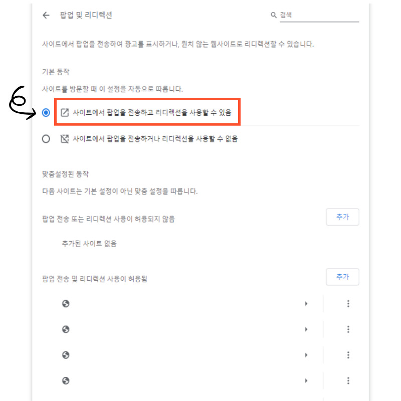 6. 기본적으로 '사이트에서 팝업을 전송하거나 리디렉션을 사용할 수 없음'으로 설정되어 있습니다. '사이트에서 팝업 및 리디렉션 사용 할 수 있도록 허용' 하면 크롬의 팝업 차단이 해제됩니다. 다만, 팝업 차단 기능을 해제한 상태로 계속 사용하게 되면 사이트 보안이 취약해질 수 있으므로 필요한 작업을 완료하신 후 다시 차단해 주시는 것이 좋습니다. 만약 특정사이트만 차단을 해제하고 싶으시다면 '맞춤설정된 동작' 아래쪽 '추가'를 클릭하신 후 해당 사이트 주소를 입력해 주시면 됩니다.