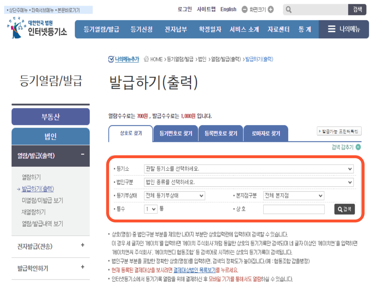 2. 좌측에 있는 '발급하기(출력)'을 선택한 후 등기소, 법인구분, 등기부상태, 통수, 상호명을 입력한 후 '검색'을 클릭합니다. 법인 관할지역을 모른다면 '전체 등기소'를 선택하시면 됩니다. 수수료의 경우 열람은 700원, 발급은 1,000원입니다.