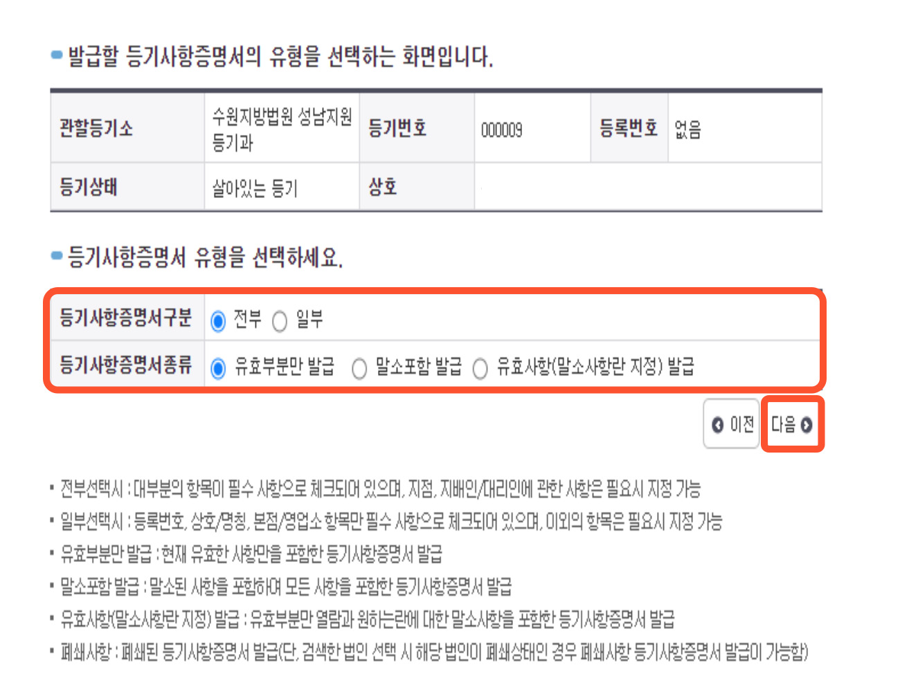 3. 발급할 등기사항 증명서의 내용을 확인한 다음 하단에 있는 '등기사항증명서 유형'을 선택한 후 '다음'을 눌러줍니다.