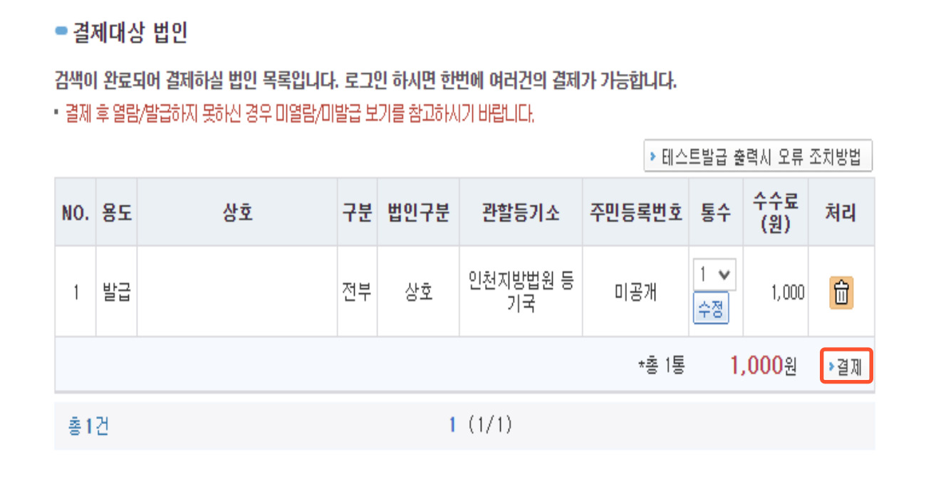 5. 수수료를 결제하면 법인등기부등본 발급이 완료됩니다.