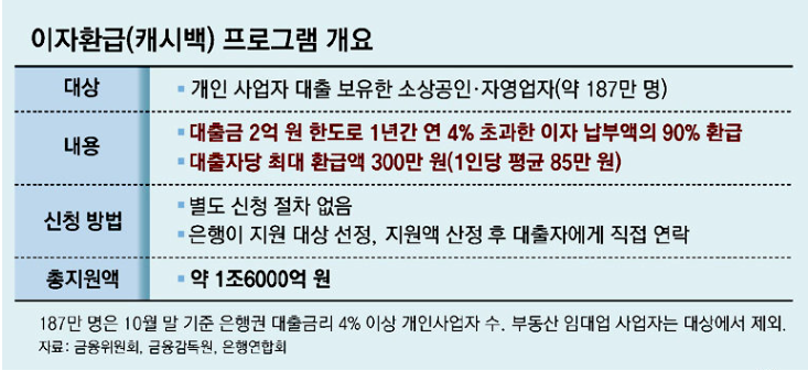 대출금 2억 원을 한도로 1년간 대출 금리 4%를 초과한 이자 납부액의 90%를 환급해주며, 대출 자영업자 1인당 최대 300만 원까지 환급 받을 수 있습니다.