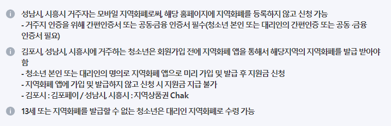 - 지원방법 : 본인 명의의 지역화폐로 지원금 지급 (단, 13세 또는 휴대폰이 없거나 지역화폐 App을 설치할 수 없는 휴대폰을 이용하는 청소년은 대리인의 지역화폐로 지급)